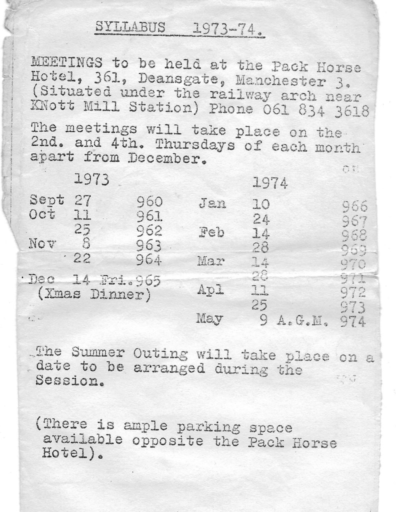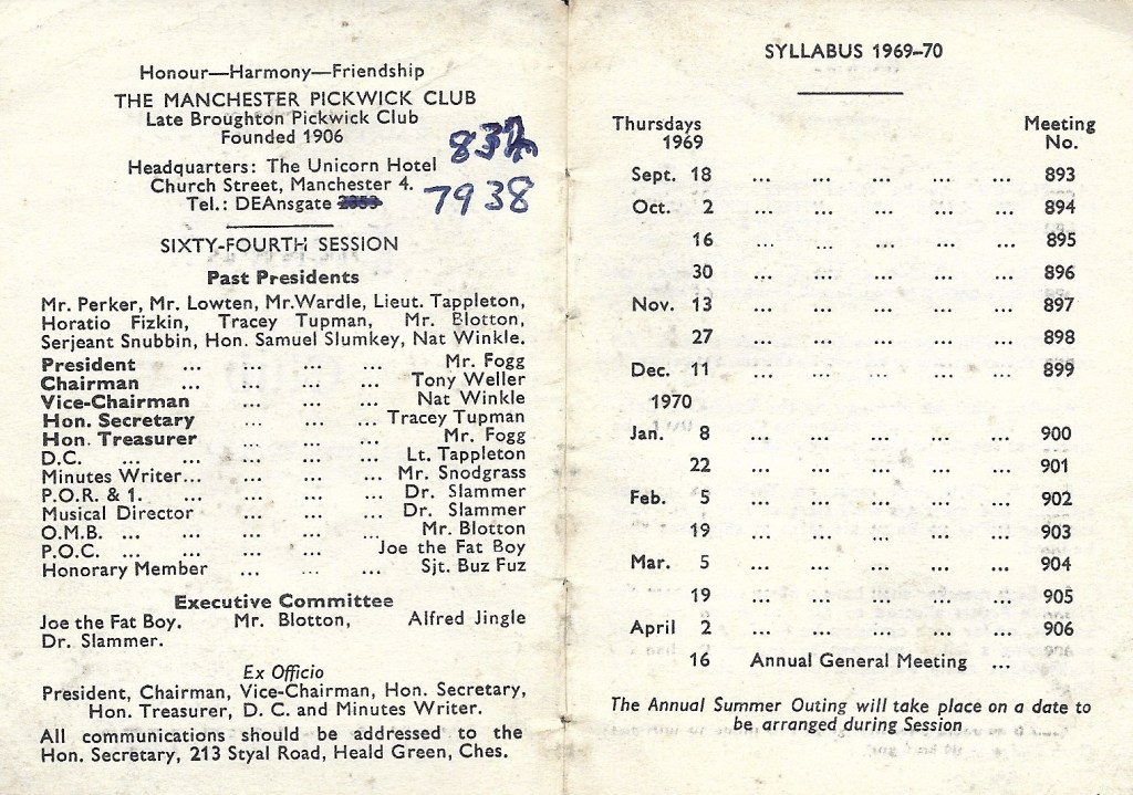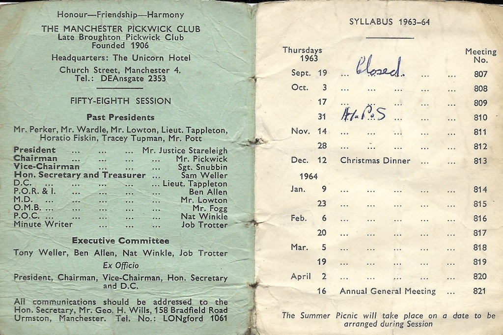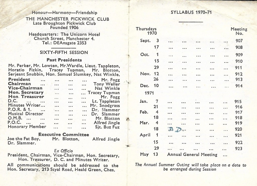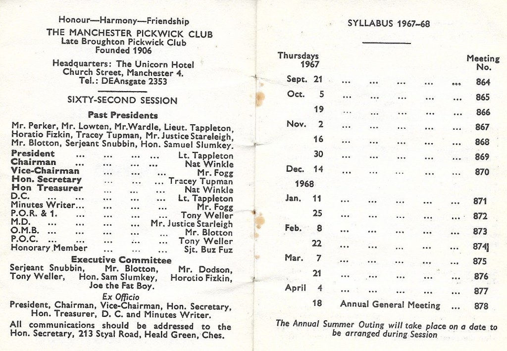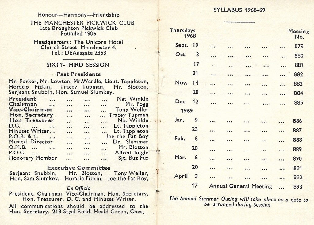 Meetings of the Manchester Pickwick Club take place at 8pm on the 3rd Wednesday of the month, between September and April and are held at The Moorside Social Club in Swinton, Greater Manchester. The April meeting is the AGM (Annual General Meeting) when appointments to officer positions are made for the following year and annual subscriptions are taken.