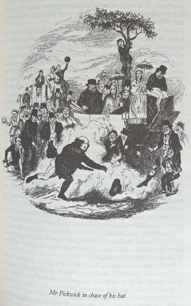 Mr. Pickwick, we say, was completely exhausted, and about to give up the chase, when the hat was blown with some violence against the wheel of a carriage, which was drawn up in a line with half a dozen other vehicles on the spot to which his steps had been directed. Mr. Pickwick, perceiving his advantage, darted briskly forward, secured his property, planted it on his head, and paused to take breath. He had not been stationary half a minute, when he heard his own name eagerly pronounced by a voice, which he at once recognised as Mr. Tupman’s, and, looking upwards, he beheld a sight which filled him with surprise and pleasure.